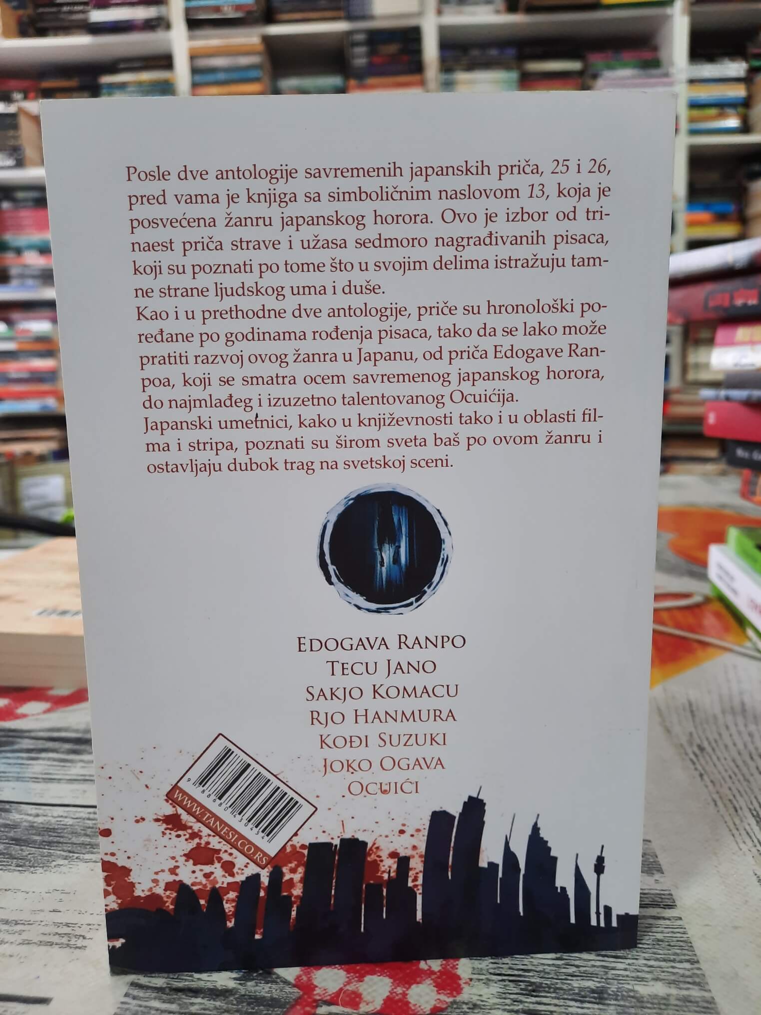 Posle dve antologije savremenih japanskih priča, 25 i 26, pred vama je knjiga sa simboličnim naslovom 13, koja je posvećena žanru japanskog horora. Ovo je izbor od trinaest priča strave i užasa sedmoro nagrađivanih pisaca, koji su poznati po tome što u svojim delima istražuju tamne strane ljudskog uma i duše. Kao i u prethodne dve antologije, priče su hronološki poređane po godinama rođenja pisaca, tako da se lako može pratiti razvoj ovog žanra u Japanu, od priča Edogave Ranpoa, koji se smatra ocem savremenog japanskog horora, do najmlađeg i izuzetno talentovanog Ocuićija.