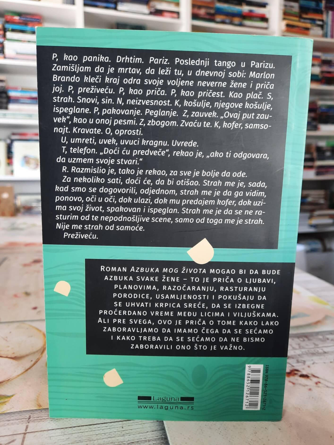 • Roman o ženi koju ostavlja muž i koja, nabrajajući asocijacije po azbučnom redu, pokušava da odagna paniku i složi sopstveni život. Priča govori o ljubavi, planovima, razočaranju, raspadu porodice, usamljenosti i potrebi da se sačuva ono što je važno.