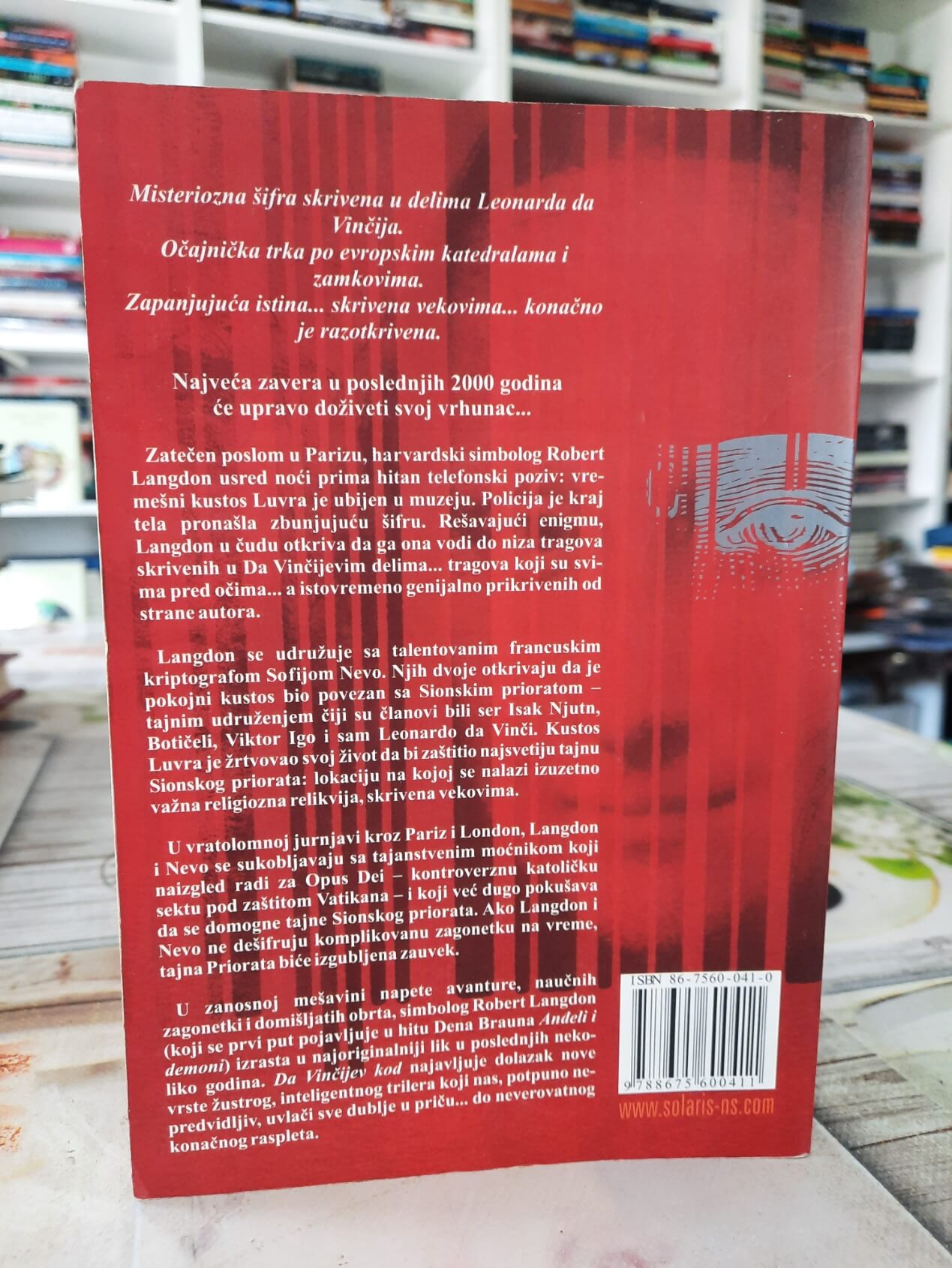 „Da Vinčijev kod“ Dena Brauna je brz i napet triler koji spaja zagonetke, simbole i istorijske reference sa savremenom potragom kroz Pariz i Evropu. Kada je u Luvru ubijen kustos, harvardski profesor simbologije Robert Lengdon biva uvučen u istragu – i vrlo brzo postaje i osumnjičeni. Uz kriptološkinju Sofi Nevo kreće u beg i u dešifrovanje tragova koji vode kroz umetnička dela Leonarda da Vinčija, tajna društva i šifrovane poruke. Kako se slagalica sklapa, postaje jasno da neko želi da određena tajna zauvek ostane skrivena, a Lengdon i Sofi imaju malo vremena da je pronađu pre nego što bude kasno.
