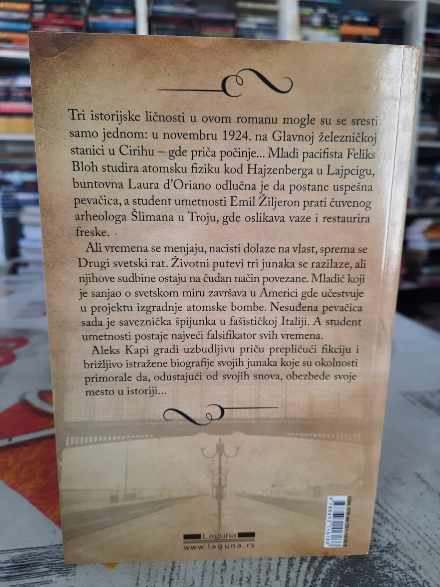 „Tri sudbine utkane u književnu simfoniju koja će još dugo odjekivati.“ Kleine Zeitung Autor bestselera Leon i Luiz . Tri istorijske ličnosti u ovom romanu mogle su se sresti samo jednom: u novembru 1924. na Glavnoj železničkoj stanici u Cirihu – gde priča počinje… Mladi pacifista Feliks Bloh studira atomsku fiziku kod Hajzenberga u Lajpcigu, buntovna Laura d’Oriano odlučna je da postane uspešna pevačica, a student umetnosti Emil Žiljeron prati čuvenog arheologa Šlimana u Troju, gde oslikava vaze i restaurira freske. Ali vremena se menjaju, nacisti dolaze na vlast, sprema se Drugi svetski rat. Životni putevi tri junaka se razilaze, ali njihove sudbine ostaju na čudan način povezane. Mladić koji je sanjao o svetskom miru završava u Americi gde učestvuje u projektu izgradnje Atomske bombe. Nesuđena pevačica sada je saveznička špijunka u fašističkoj Italiji. A student umetnosti postaje najveći falsifikator svih vremena. Aleks Kapi gradi uzbudljivu priču preplićući fikciju i brižljivo istražene biografije svojih junaka koje su okolnosti primorale da, odustajući od svojih snova, obezbede svoje mesto u istoriji… Format: 13×20 cm Broj strana: 256 Pismo: Latinica Povez: Mek