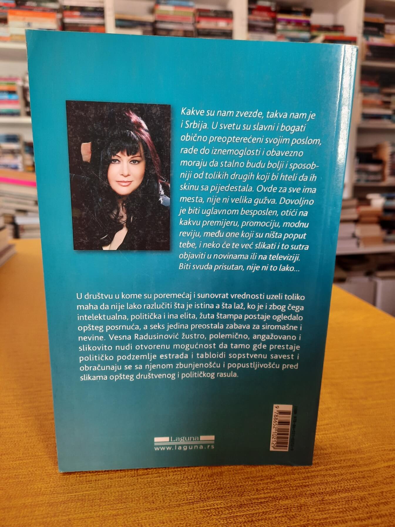 U društvu u kome su poremećaj i sunovrat vrednosti uzeli toliko maha da nije lako razlučiti šta je istina a šta laž, ko je i zbog čega intelektualna, politička i ina elita, žuta štampa postaje ogledalo opšteg posrnuća, a seks jedina preostala zabava za siromašne i nevine. Vesna Radusinović žustro, polemično, angažovano i slikovito nudi otvorenu mogućnost da tamo gde prestaje političko podzemlje estrada i tabloidi sopstvenu savest i obračunaju se sa njenom zbunjenošću i popustljivošću pred slikama opšteg društvenog i političkog rasula.